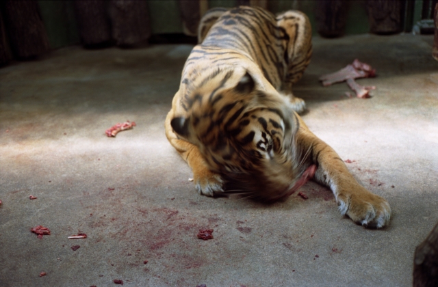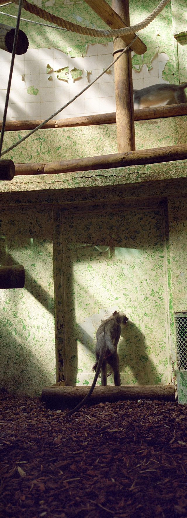 In the in the Ménagerie du Jardin des Plantes in Paris for example, the conditions in which animals are kept are shocking. It is a beautiful architecture from the time of the Art Nuveau period, but the animals are still kept like decorative objects in small enclosures. 'Sad Snake' shows a python who lives in two squared meters, with a little bit of water, two dry branches and a painted forest on the wall.